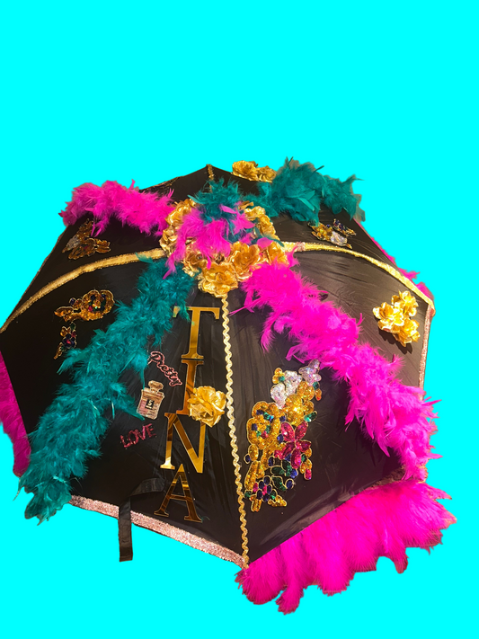 Custom Second Line Umbrella – Personalized Feather & Glitter Parade Umbrella starting price $40